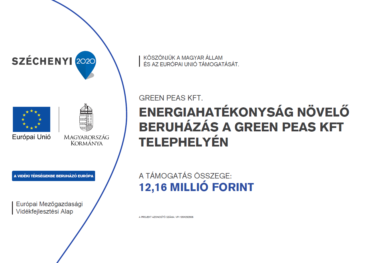 A projekt címe: Energiahatékonyság növelő beruházás a Green Peas KFT telephelyén